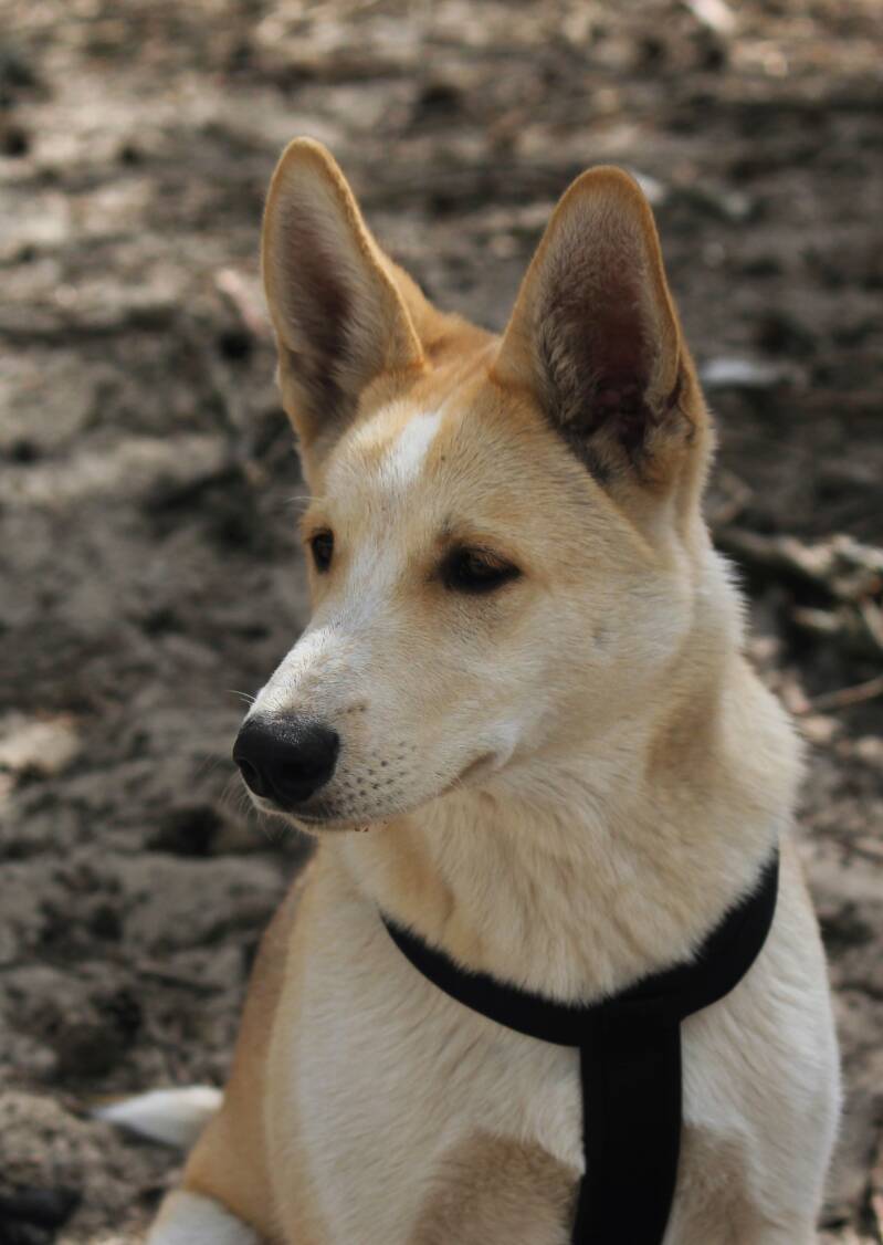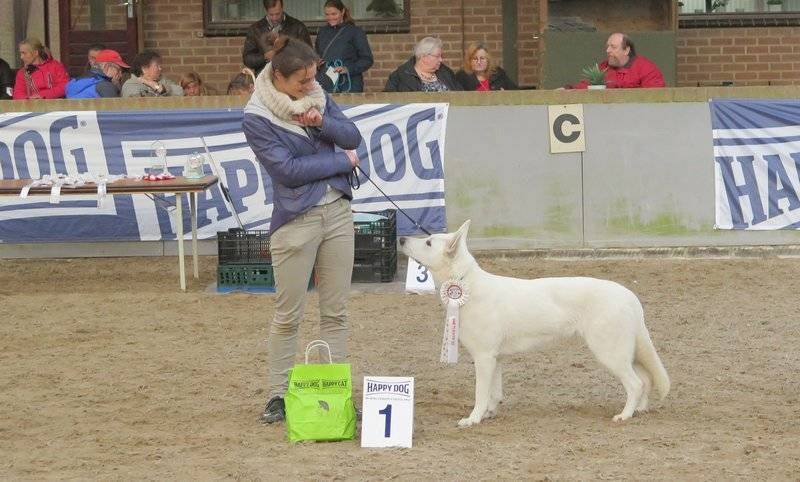 17 months, good measure and proportions, nice type,enough stretched female head,a bit round,dark brown eye,good shaped a bit wide worn ears, complete scissor bit,under jaw could be a bit more firm,good neck and back,a bit slaned pelvis,not enough front and may become heavier,back stronger angulation then front,turned feet a bit too much bit are nicely closed,and dark nails.good fur and tail.effortless, regular gaith.friendly behaviour. 1 Ex
