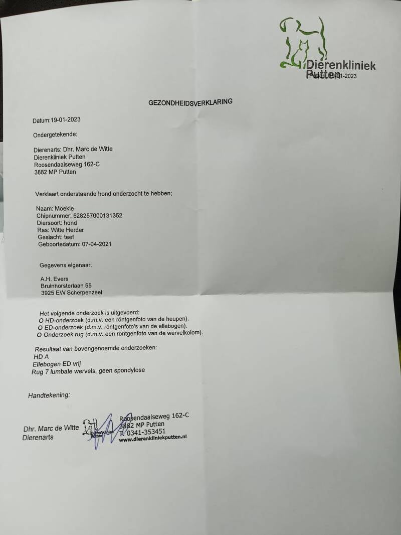 Moekie is vrij van HD, ED en Rugafwijkingen!