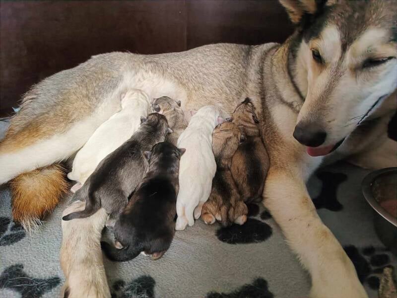 En ja hoor. Dat gebeurde. Diva begon de kleintjes direct te wassen en hoewel ze nog niet direct melk kon geven, liet ze de pups wel aan haar tepels sabbelen. Binnen 48 uur was er al echt sprake van melkproductie en hebben de pups, naast flesvoeding, ook echte moedermelk kunnen drinken!