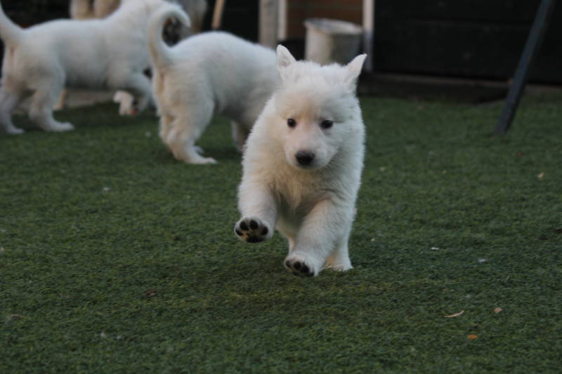 De pups zijn al weer 4 weken oud en doen het geweldig goed. Geen achterblijvers, maar allemaal mooi op gewicht en heel actief momenteel.