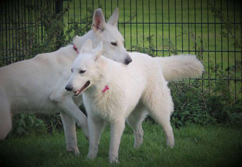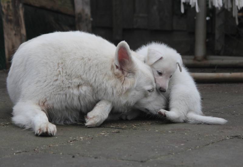 Zora vind het allemaal fantastisch fascinerend die kleine witte bolletjes. In het begin was Diva erg beschermend en liet ze Zora niet dichtbij komen. Maar inmiddels heeft Zora het vertrouwen gewonnen en heeft uitgebreid kennis mogen maken met haar kleine neefjes en nichtjes. Zo mooi om te zien hoe ze opeens gezamelijk voor de pups aan het zorgen zijn. ♡