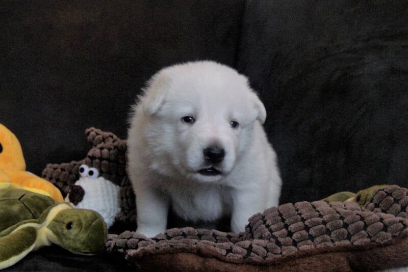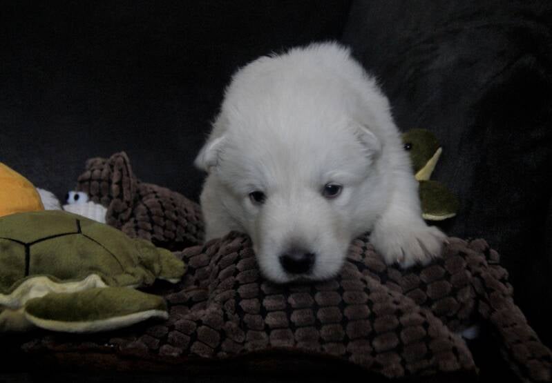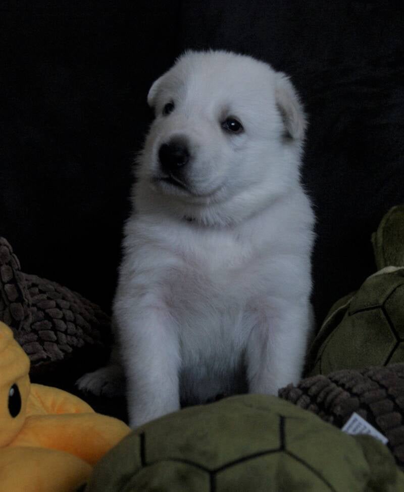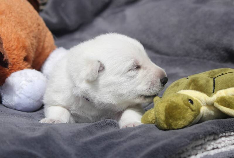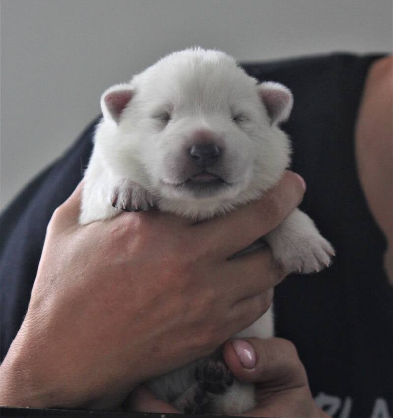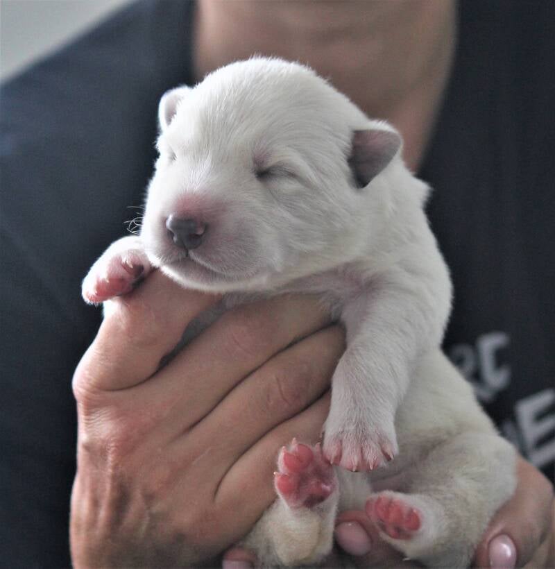 De pups zijn al weer een week oud en worden al lekkere stevige ijsbeertjes. Bij een aantal komt ook het zwarte pigment al goed door.