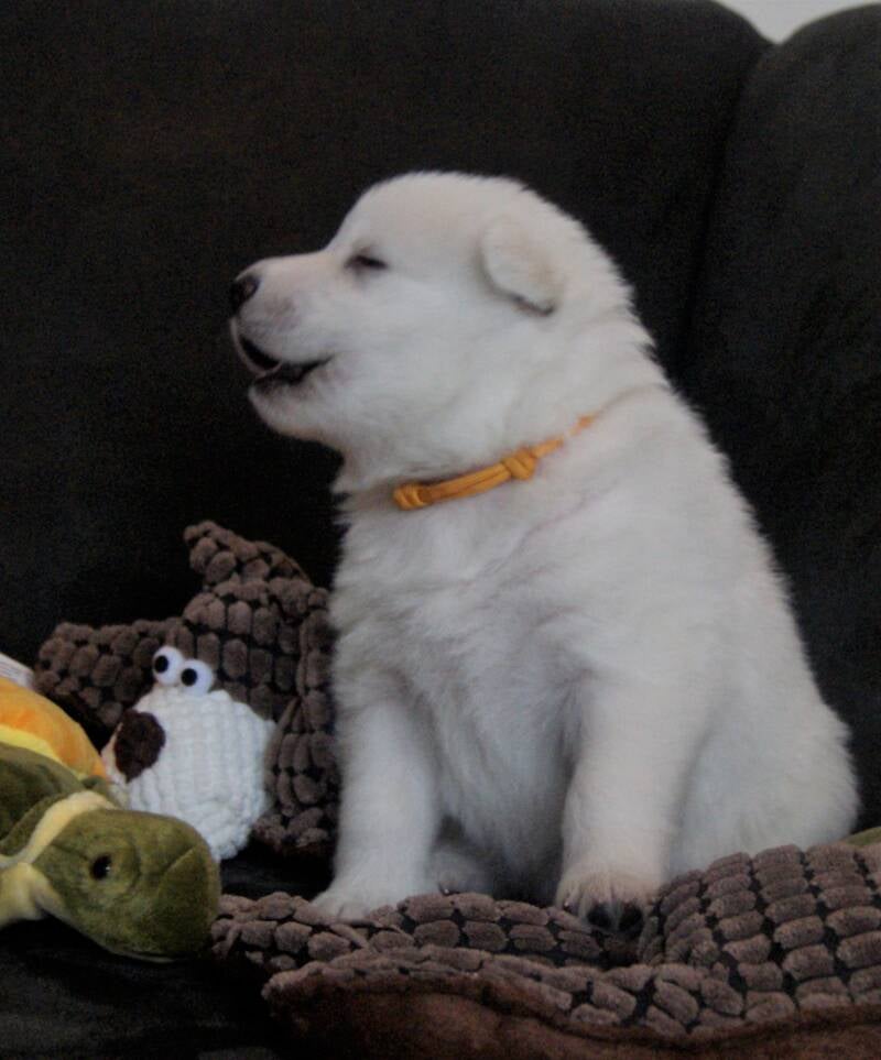 Kyra is een écht witte herder zoals staat omschreven in de rasstandaard. Thuis is ze goed waaks en bij vreemde mensen of nieuwe situaties is ze wat terughoudend. Ze luistert goed naar haar baas en is vooral een heel zachtaardige hond die geen conflict zal opzoeken, maar dit eerder uit de weg zal gaan. Ze heeft een prachtige witte vacht en mooie correcte lichaamsbouw. Toch is ze niet enorm hoog qua rug, wat ik zelf een pluspunt vind.