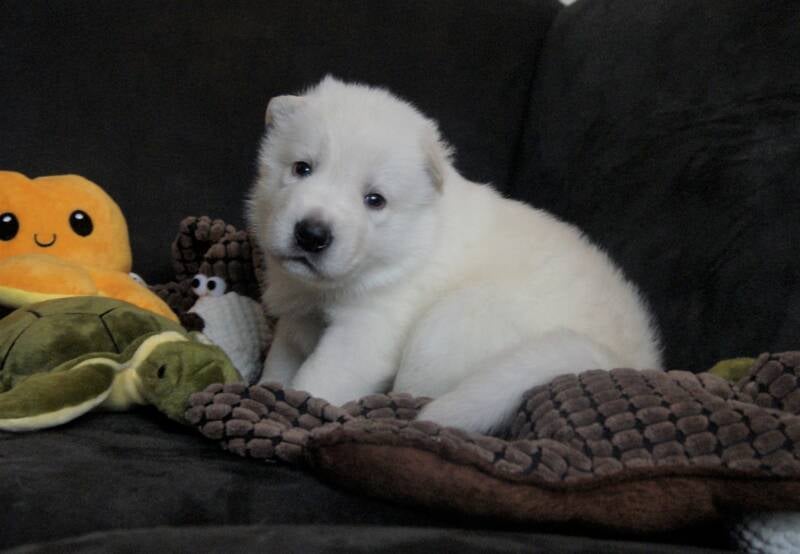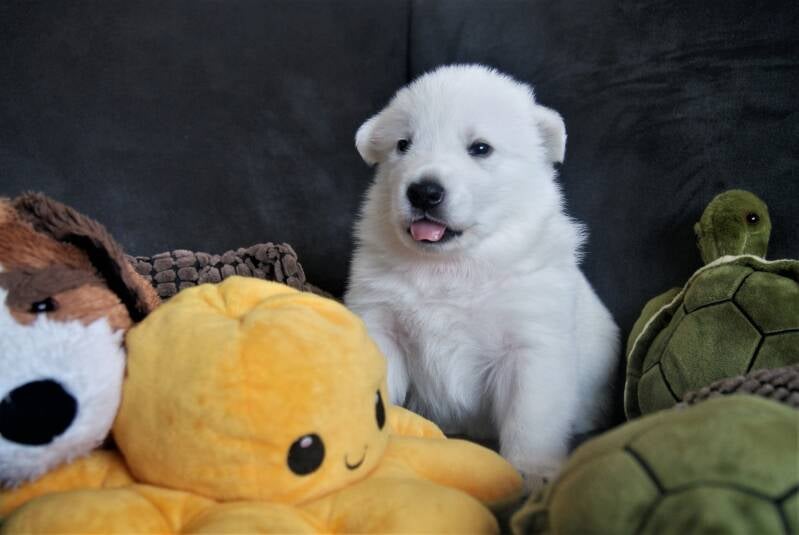 Omdat Alla de pups prima op het oog uit elkaar weet te houden, hebben ze nu ook geen bandjes om. Met een klein nestje is dat natuurlijk ook nog wel goed te doen.